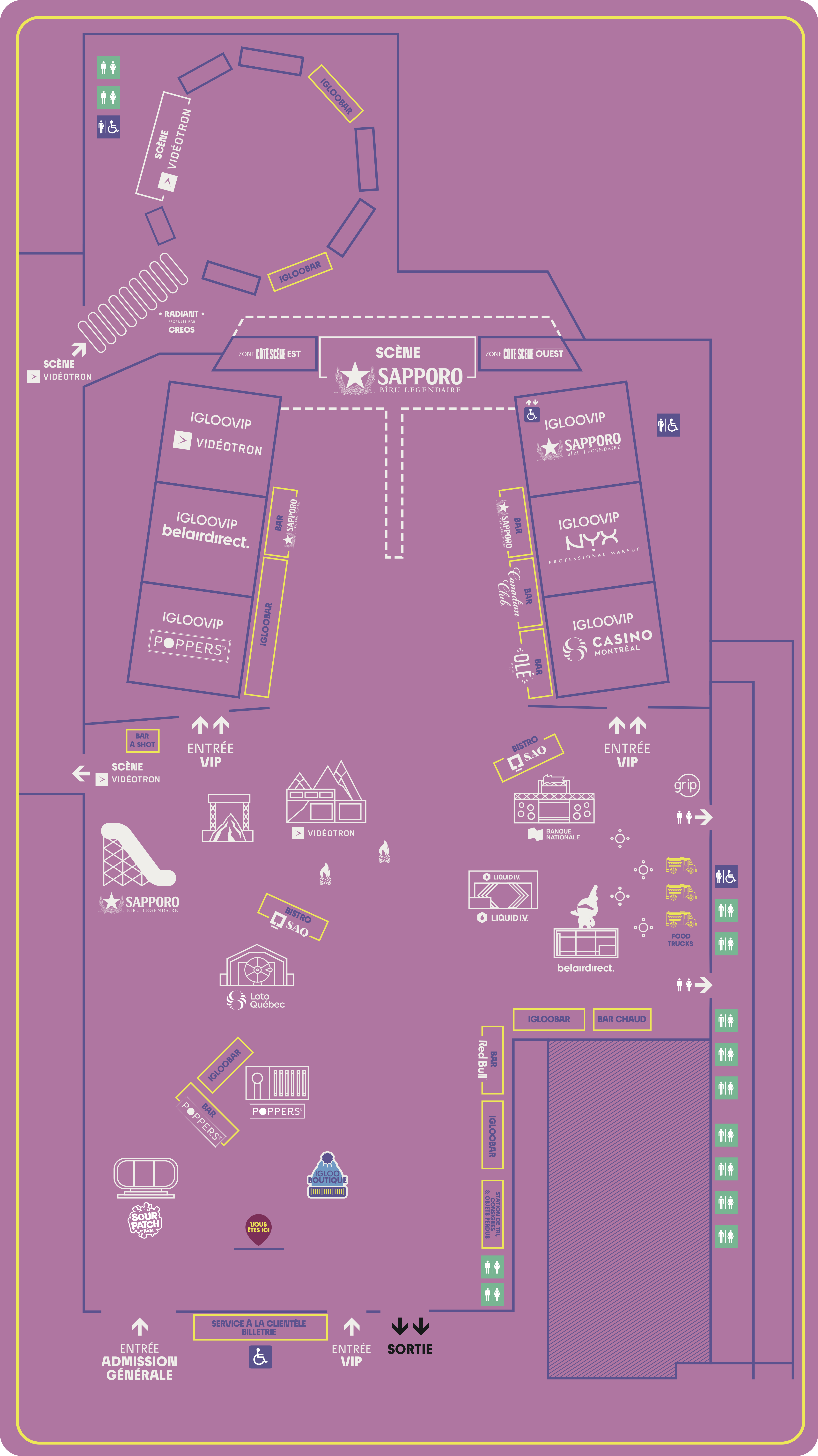 Afin de faciliter l'accès et d'améliorer l'expérience Igloofest pour les personnes à mobilité réduite, nous vous invitons à vous rendre au bureau du service à la clientèle situé à l'entrée du site pour échanger votre billet d'entrée générale contre un billet VIP. Cela vous donnera accès à la zone VIP Sapporo. De plus, l'entrée est gratuite pour votre accompagnateur, qui n'aura pas besoin d'acheter de billet !